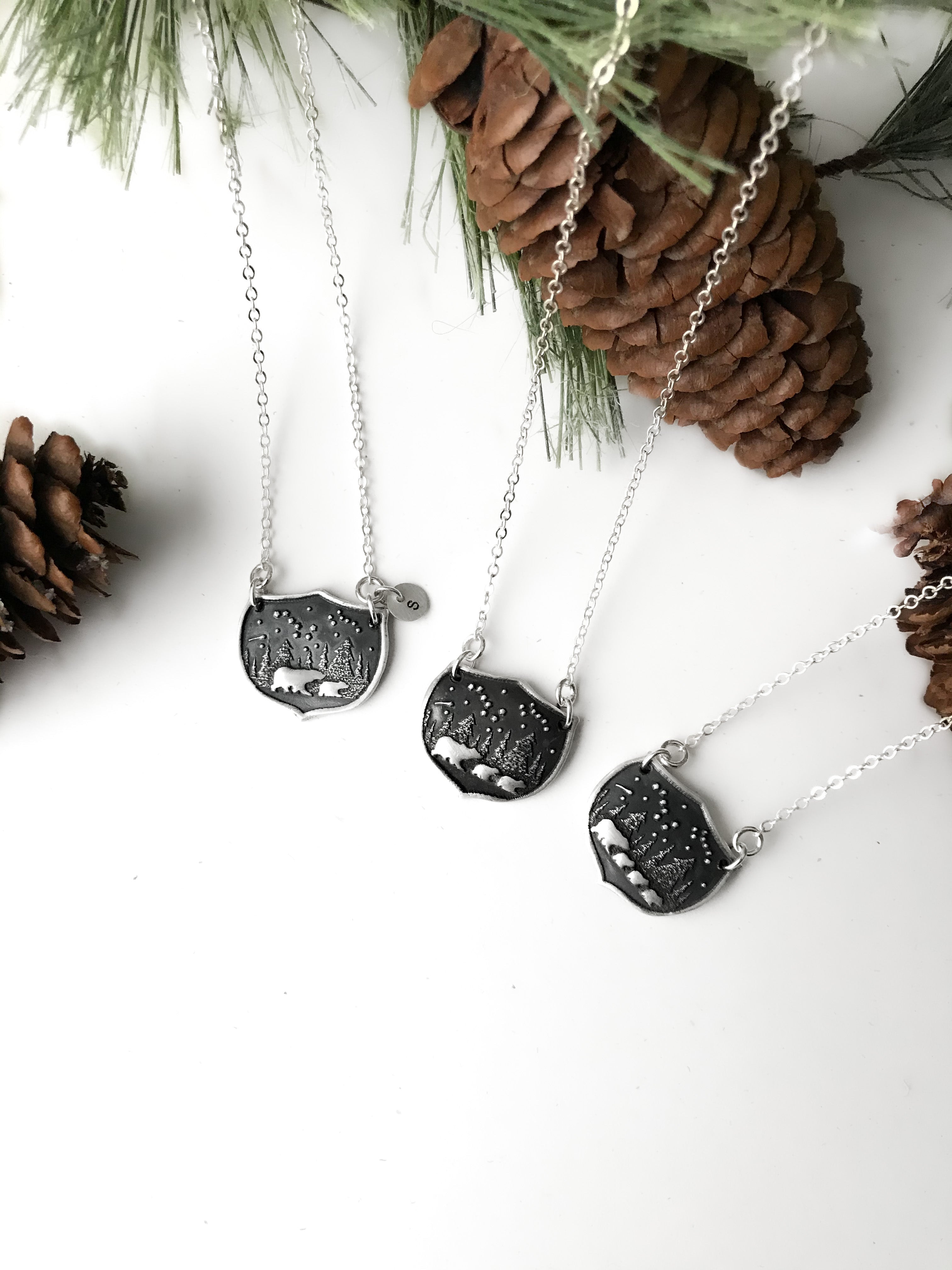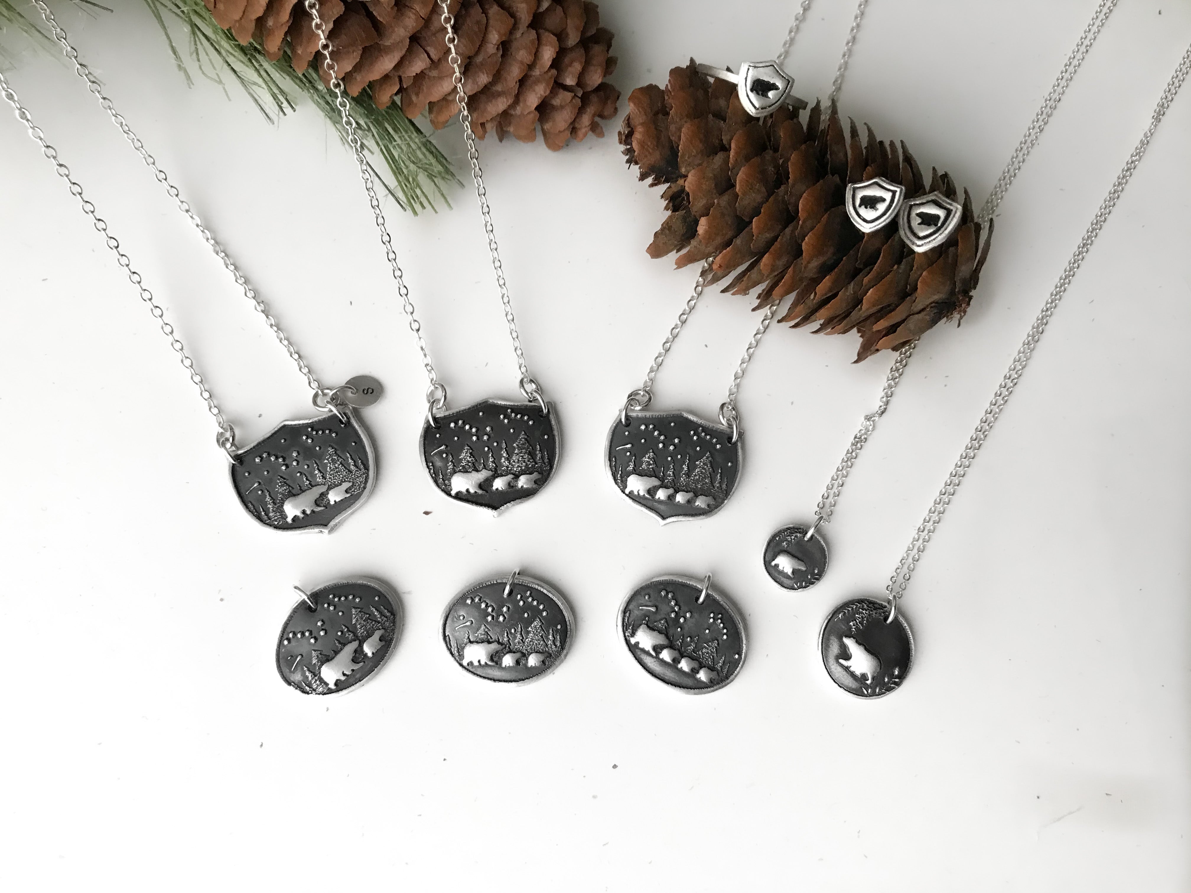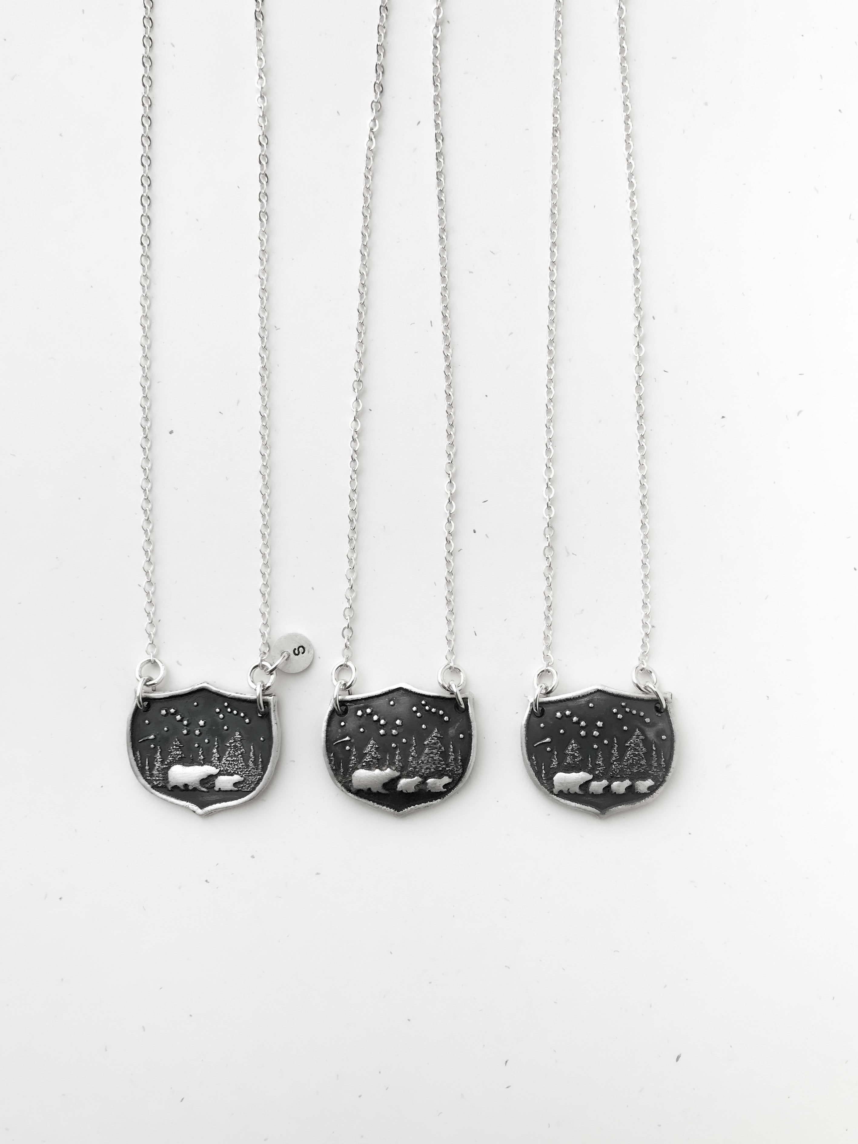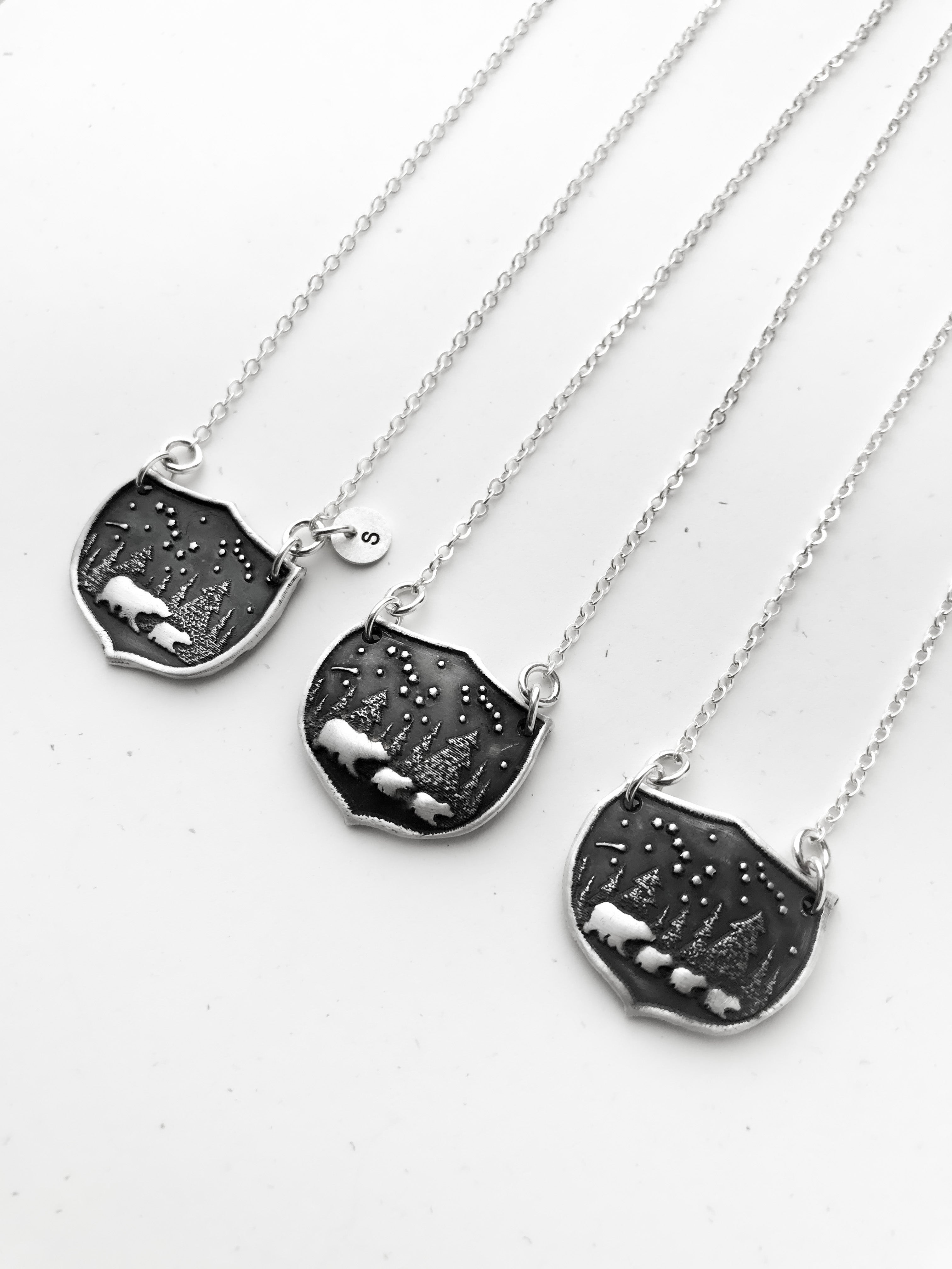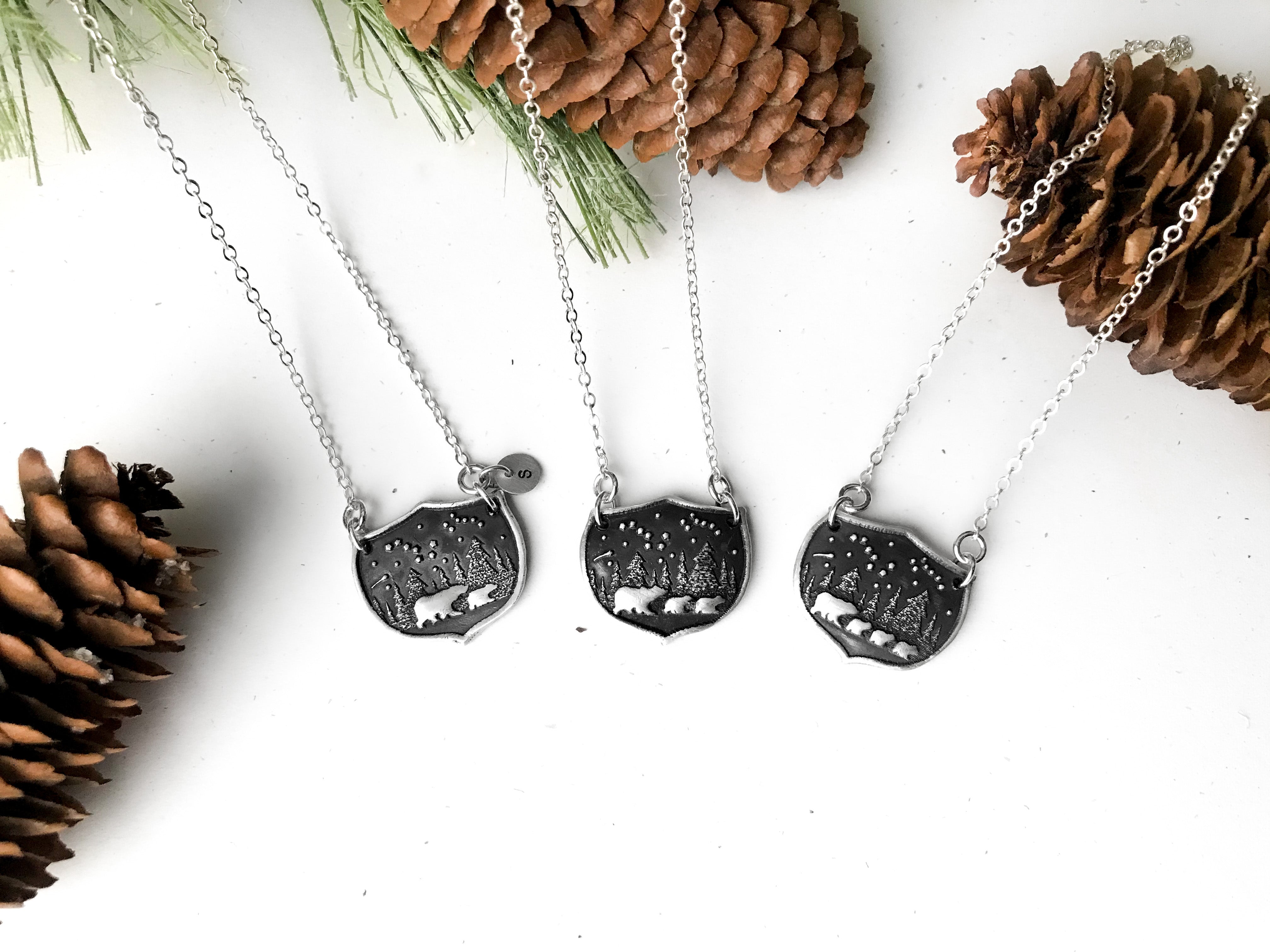 Show your love and fierce protection for your children with this adorable Mama Bear and Baby bear shield necklace. Wondering the woods under the Stars, you can see the Big Dipper and Little Dipper in the distance. This piece is handcrafted to order with Fine silver and Sterling Silver and can be personalized with initials and the number of children in a family. This mama bear & baby bear jewelry makes an ideal gift for a new mom, mom of many or grandmothers.