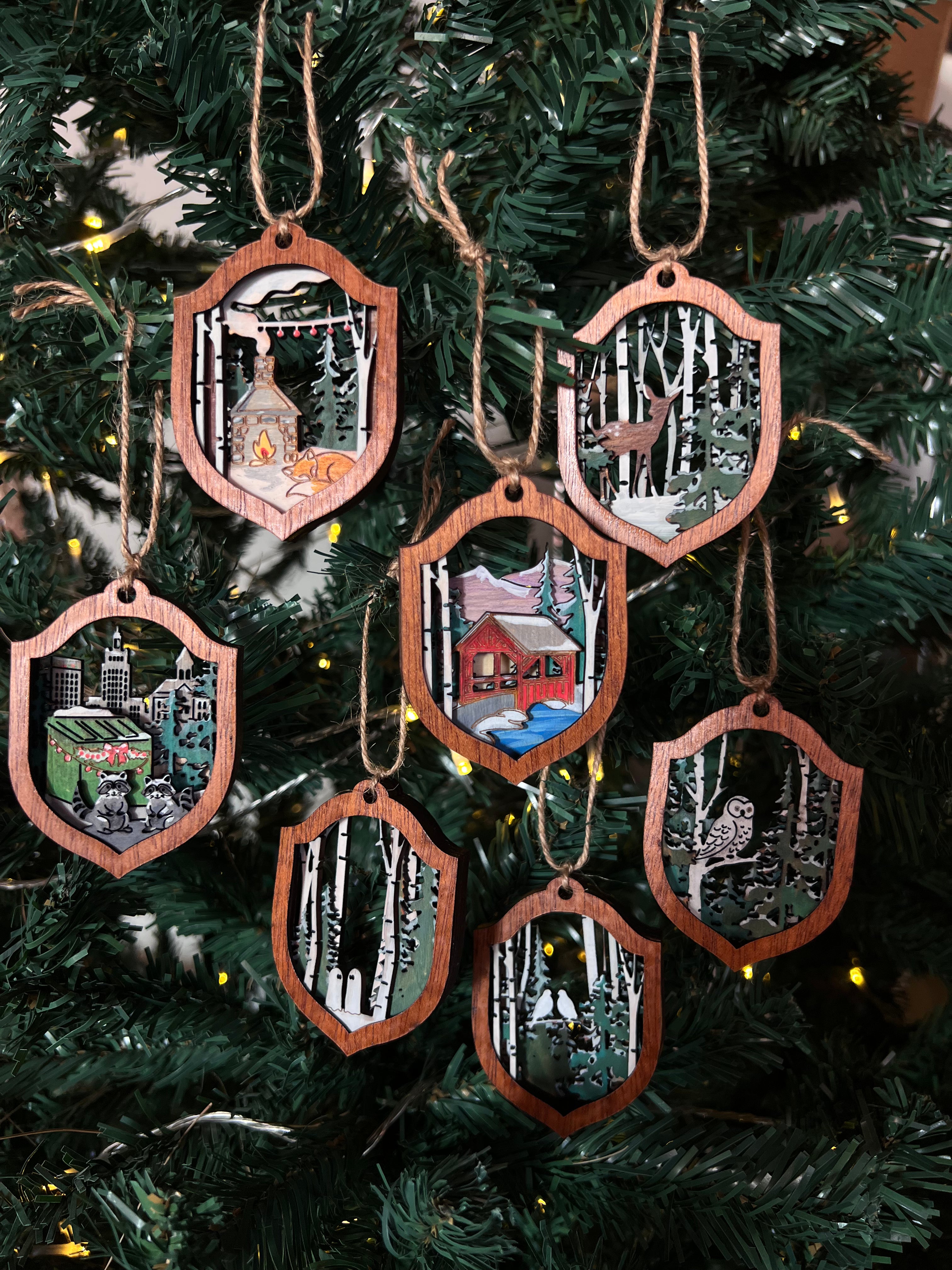 Choose from snowy cabins, owls in the pines, curious raccoons, misty birch groves, red covered bridges, sleeping foxes, tiny ghosts and more—every ornament feels like a story waiting to be told. Perfect for Christmas trees, garlands, gift toppers, woodland nurseries, or year-round display for anyone who loves cozy winters, forests, and folk art.