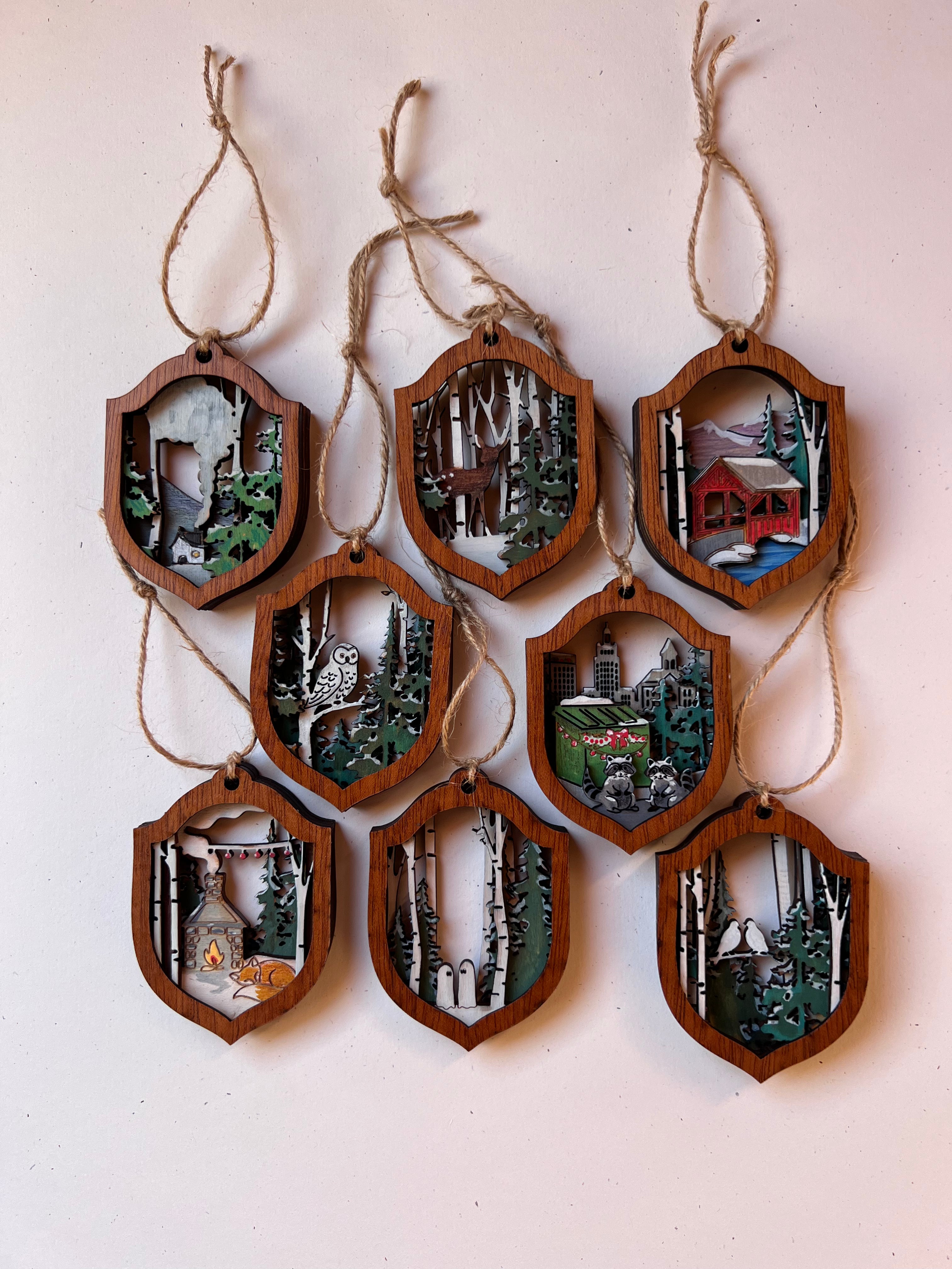 Choose from snowy cabins, owls in the pines, curious raccoons, misty birch groves, red covered bridges, sleeping foxes, tiny ghosts and more—every ornament feels like a story waiting to be told. Perfect for Christmas trees, garlands, gift toppers, woodland nurseries, or year-round display for anyone who loves cozy winters, forests, and folk art.