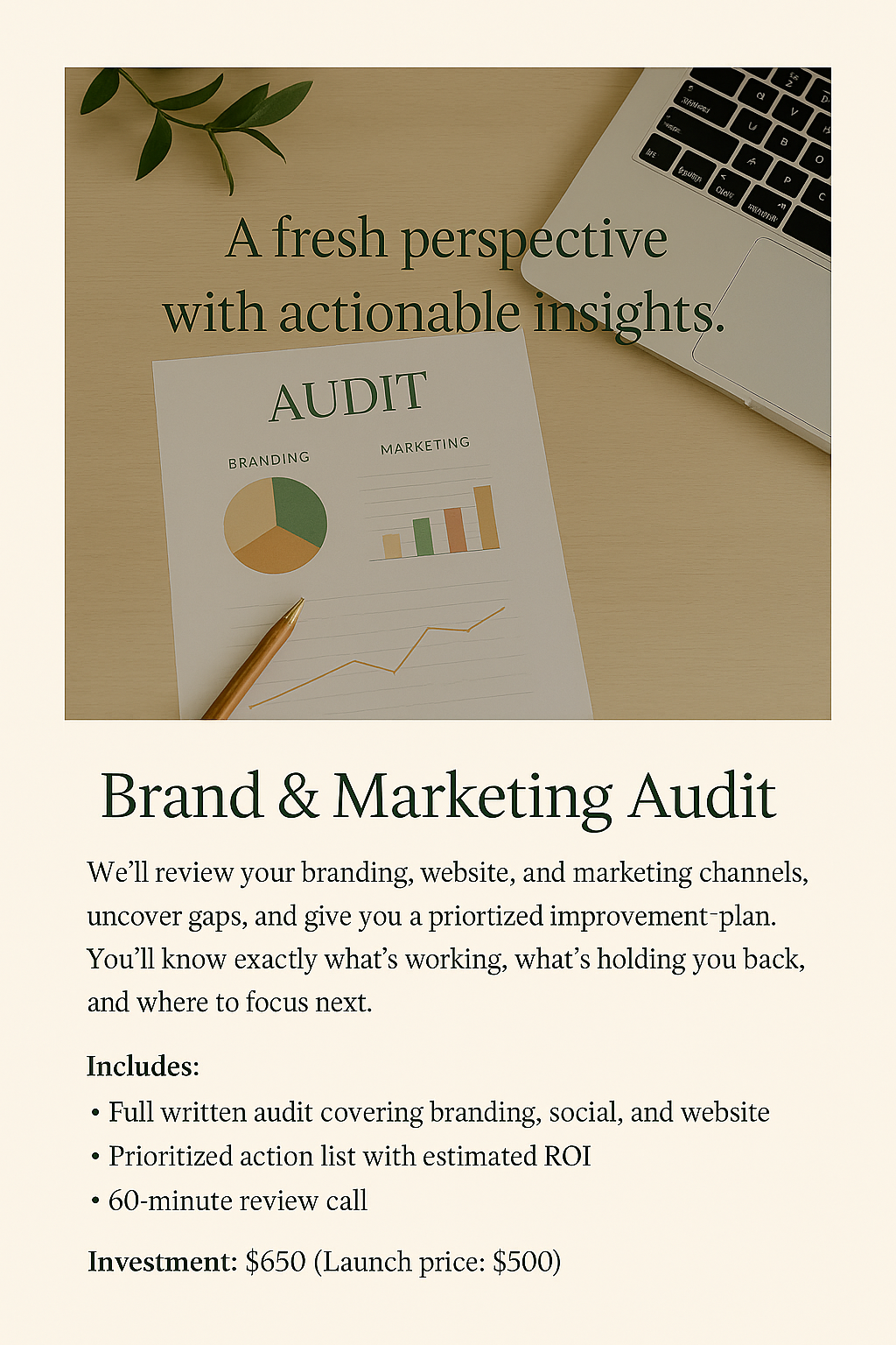 We’ll review your branding, website, and marketing channels, uncover gaps, and give you a prioritized improvement plan. You’ll know exactly what’s working, what’s holding you back, and where to focus next.